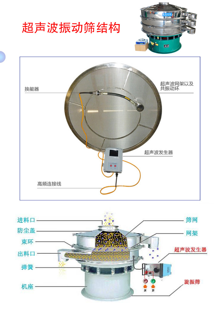 超聲波振動篩是將220v、50HZ或110v、60HZ電能轉化為38KHZ的高頻電能,輸入超聲換能器,將其變成38KHZ機械振動,從而達到篩分和清網的目的。