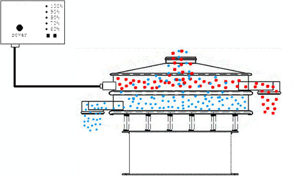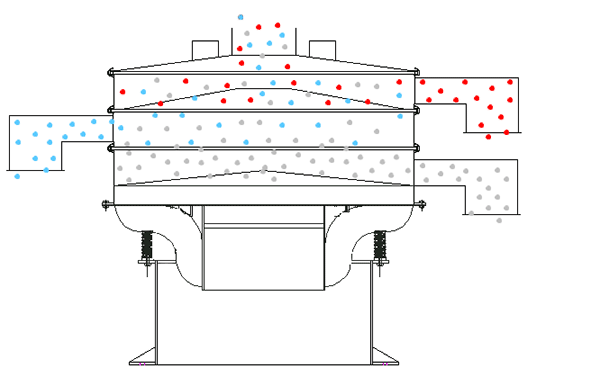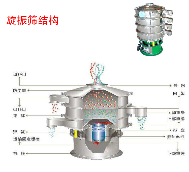 旋振篩是由直立式電機作激振源,電機上、下兩端安裝有偏心重錘,將電機的旋轉運動轉變為水平、垂直、傾斜的三次元運動,再把這個運動傳遞給篩面。調節上、下兩端的相位角,可以改變物料在篩面上的運動軌跡。