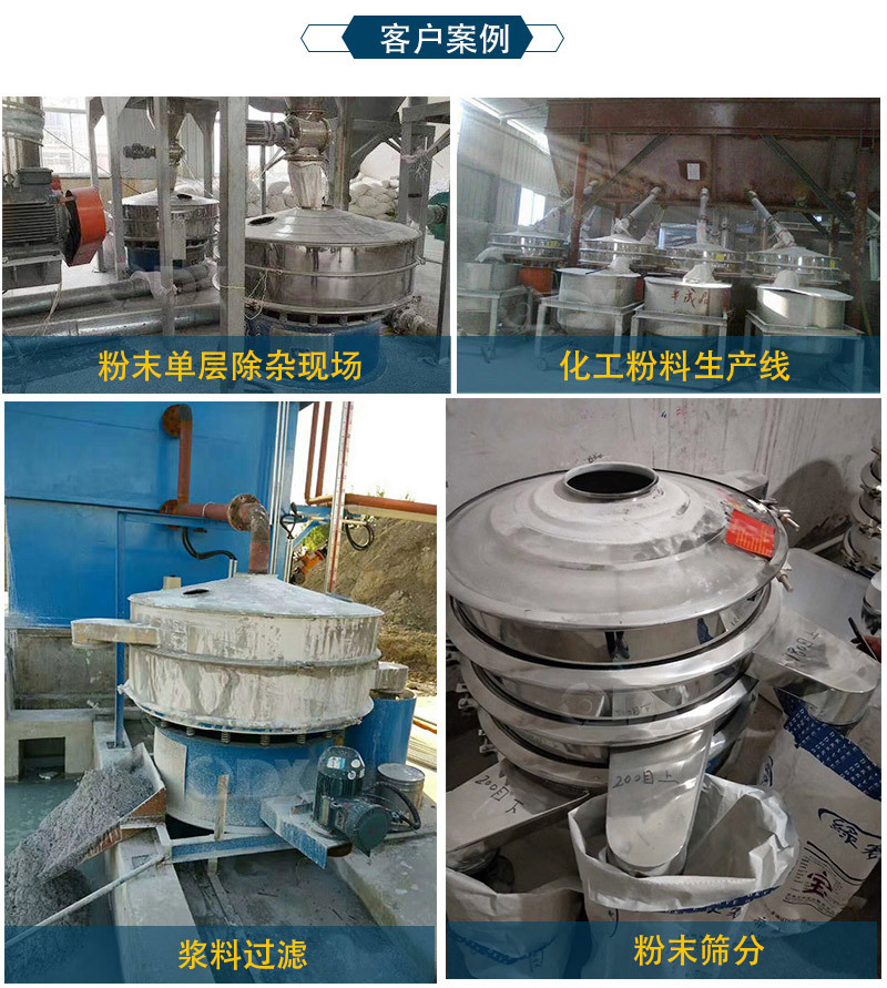 旋振篩適用于粒、粉、粘液等多種物料的篩分過濾。對于一些高精度、易團聚的粉末物料則會出現粘網現象。