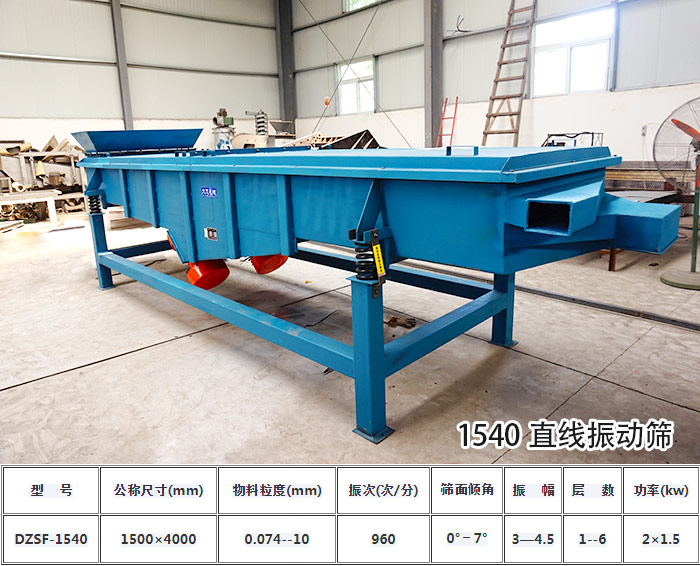 1540直線振動篩長為4000mm、寬為1500mm,它每小時可滿足3000KG左右產(chǎn)量需求。