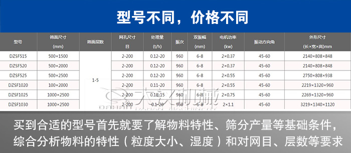想要購買到合適的型號首先就要了解物料特性、篩分產量等基礎條件,綜合分析物料的特性(粒度大小、濕度)和對網目、層數等要求。要綜合考慮材質、生產場地等條件。同時我們公司可以根據您的產量等要求為您推薦型號(DZSF-515、DZSF-520、DZSF-530、DZSF-1020、DZSF-1030、DZSF-1540等),同時大漢公司還支持設備特殊定做,為您定制專屬的篩分設備。