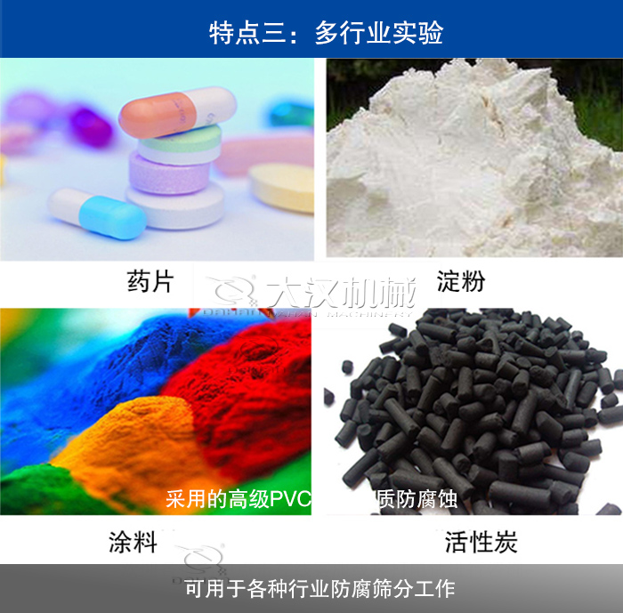 大漢機械生產的尼龍塑料振動篩廣泛應用于食品、醫藥、化工、磨料、礦山、冶金、地質、陶瓷、國防等行業的篩分、除雜、過濾、分級等精準篩分,在篩分的同時做到防腐蝕功能。