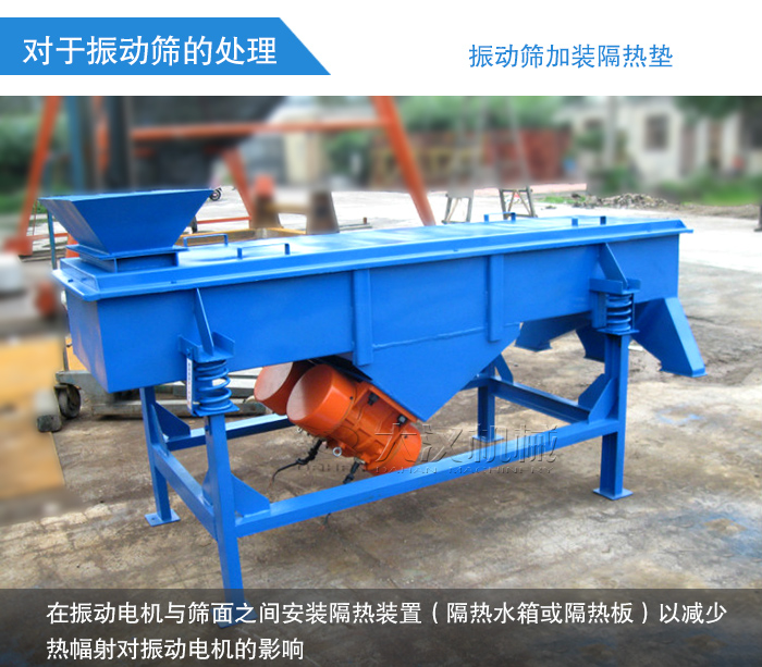 當高溫物料直接進入振動篩篩箱內,回因為高溫的原因造成振動電機燒壞,從而使振動篩不能進行正常的篩分工作。所以在振動電機與篩面之間安裝隔熱裝置(隔熱水箱或隔熱板)以減少熱幅射對振動電機的影響,保證振動電機在允許的高溫下工作。