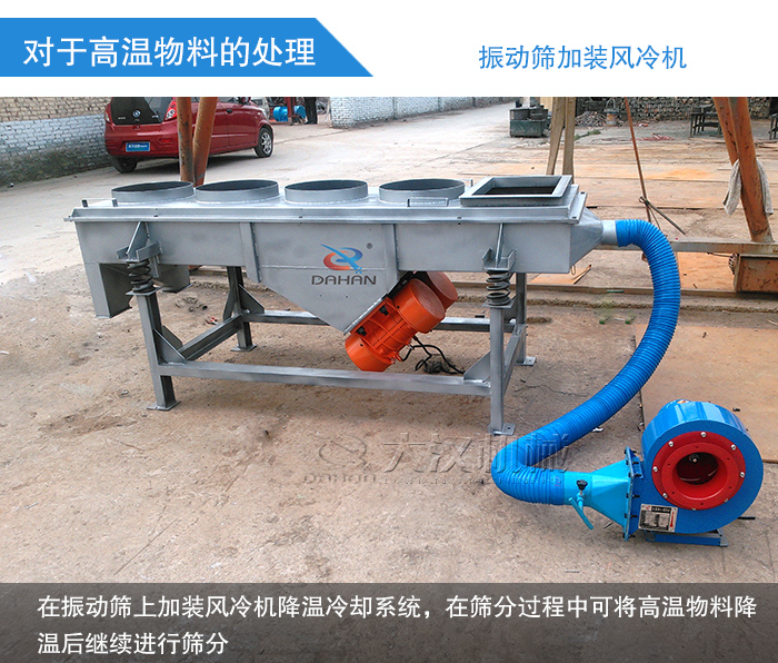如果加裝隔熱墊還是不能進行高溫物料的篩分,您就必須對高溫物料進行降溫后再行篩分,這樣的物料降溫可以在振動篩上加裝風冷機降溫冷卻系統,在篩分過程中可將高溫物料降溫后繼續進行篩分。