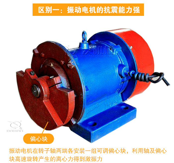 振動電機(jī)和普通電機(jī)的內(nèi)部結(jié)構(gòu)相同。主要區(qū)別是振動電機(jī)在轉(zhuǎn)子軸兩端各安裝一組可調(diào)偏心塊,利用軸及偏心塊高速旋轉(zhuǎn)產(chǎn)生的離心力得到激振力。振動電機(jī)比普通電機(jī)的機(jī)械和電氣方面都要求有可靠的抗震能力。同樣功率等級的振動電機(jī)的轉(zhuǎn)子軸要比同級別普通電機(jī)的軸粗得多。