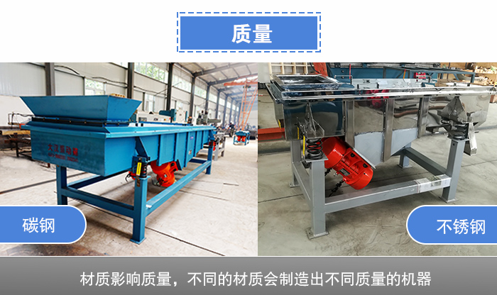 大漢機械生產的機制砂直線振動篩在選材是上精選的優質碳鋼和不銹鋼兩種材質,不銹鋼材質相比碳鋼材質多了防銹防腐耐用耐高溫的功能,使用壽命相比碳鋼材質的會更長一點,所以在價格上不銹鋼機制砂直線振動篩會比碳鋼機制砂直線振動篩貴一點,不過對于篩分機制砂來說,普通碳鋼就能滿足篩分需求。