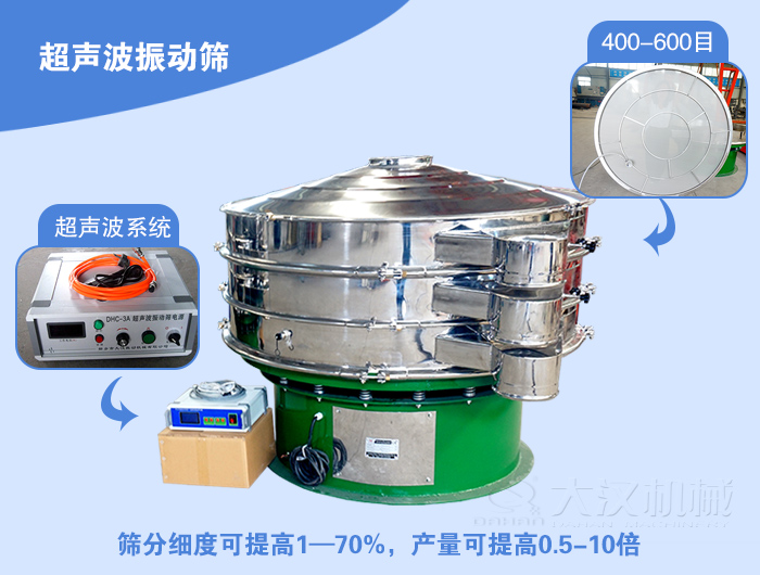 超聲波振動(dòng)篩是在普通的振動(dòng)篩上加裝了超聲波電源系統(tǒng),適用于400目 - 600目超細(xì)物料的篩分、除雜、過濾、分級。