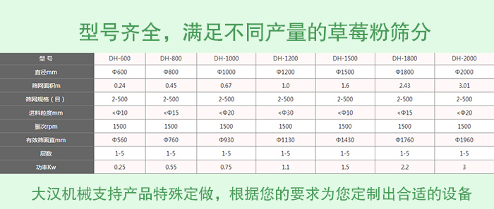 草莓粉不銹鋼旋振篩型號(直徑)有:DH-400mm、DH-600mm、DH-800mm、DH-1000mm、DH-1200mm、DH-1500mm、DH-1800mm、DH-2000mm等八種標準型號。不同型號滿足不同的草莓粉篩分產量,可滿足可以達到100kg/h-20t/h。同時大漢機械支持產品特殊定做,根據您的要求為您定制出合適的設備!