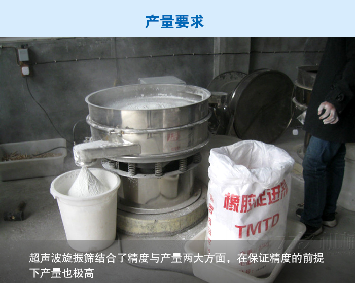 解決方法:超聲波旋振篩具有體積小、結構簡單合理、篩分精度高、維修方便、保養簡單、篩網壽命長等優點??蓡螌踊蚨鄬邮褂?,可達到五層,對物料的篩分精度可達500目或0.028mm,可根據物料性能選配適宜的篩孔,從而解決了木粉篩分精度問題。