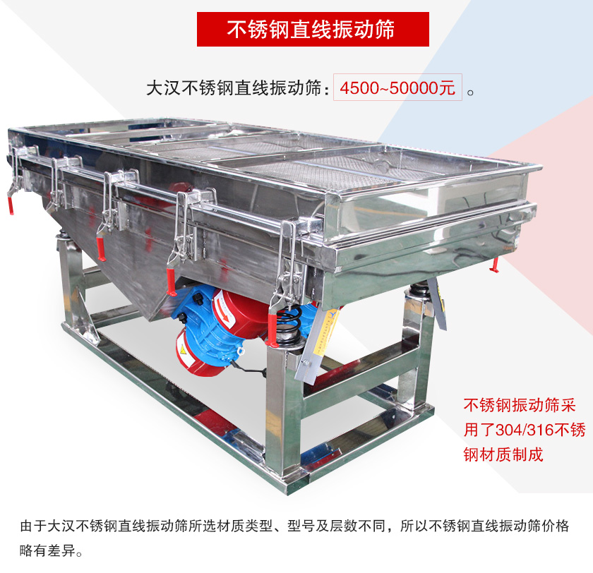 不銹鋼振動(dòng)篩采用了304/316不銹鋼材質(zhì)制成的,設(shè)備經(jīng)由拋光處理,可以用于食品、醫(yī)藥等對(duì)衛(wèi)生要求較為嚴(yán)格的行業(yè),那么不銹鋼直線振動(dòng)篩多少錢一臺(tái)呢?大漢小編這就來為您進(jìn)行介紹。