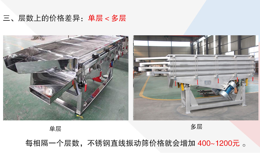 不銹鋼直線振動(dòng)篩篩面層數(shù)可至5層,單層用于除雜,多層用于分選不同粒度規(guī)格的物料,主要是按照用戶自身的篩分目的來選擇,層數(shù)越高,制造成本就越大,所以價(jià)格一般就會(huì)越貴,在材質(zhì)、型號(hào)相同情況下,每相隔一個(gè)層數(shù),不銹鋼直線振動(dòng)篩價(jià)格就會(huì)增加400~1200元。
