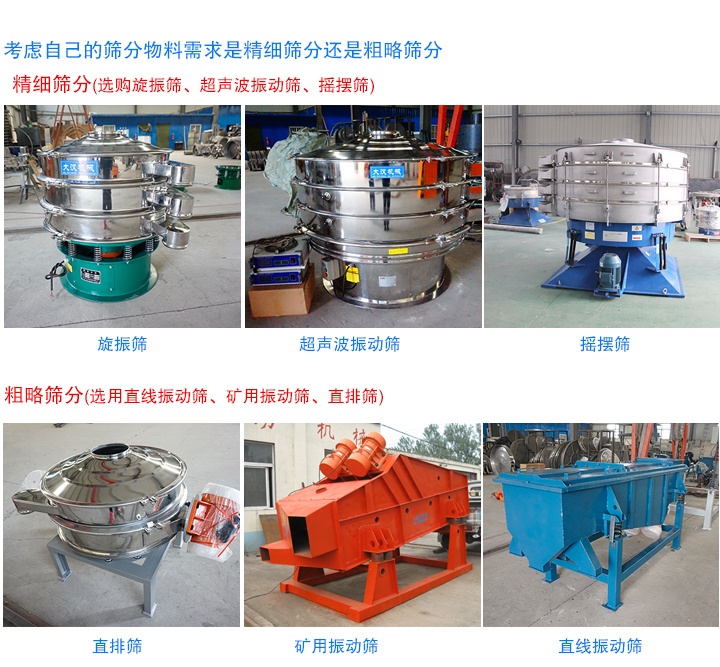 我們首先要對自己所要篩分的物料特性進行準確的評估,確定自己想要精細篩分還是粗略篩分,這樣會達到事半功倍的效果。如果是精細篩分,我們大漢推選購旋振篩、超聲波振動篩、搖擺篩等振動篩;如果是粗略篩分,選用直線振動篩、礦用振動篩、直排篩等都適合。