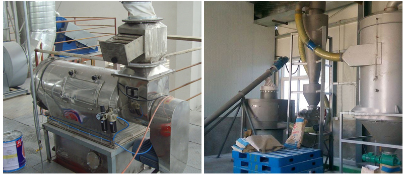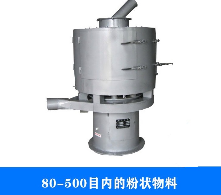 立式氣流篩分機外觀為立式,風輪葉片密集、風速高,向外噴射量大,產量比臥式氣流篩大,一般是礦產行業篩分粉料(重鈣粉等),要求被篩原料中細料90%以上,適用于細粉篩分,如面粉、石墨粉、橡膠粉、氧化鎂、珍珠巖粉、鐵粉、環氧樹脂粉等。但是立式氣流篩分機排料不方便,需要旋風除塵器和布袋除塵器組合使用。